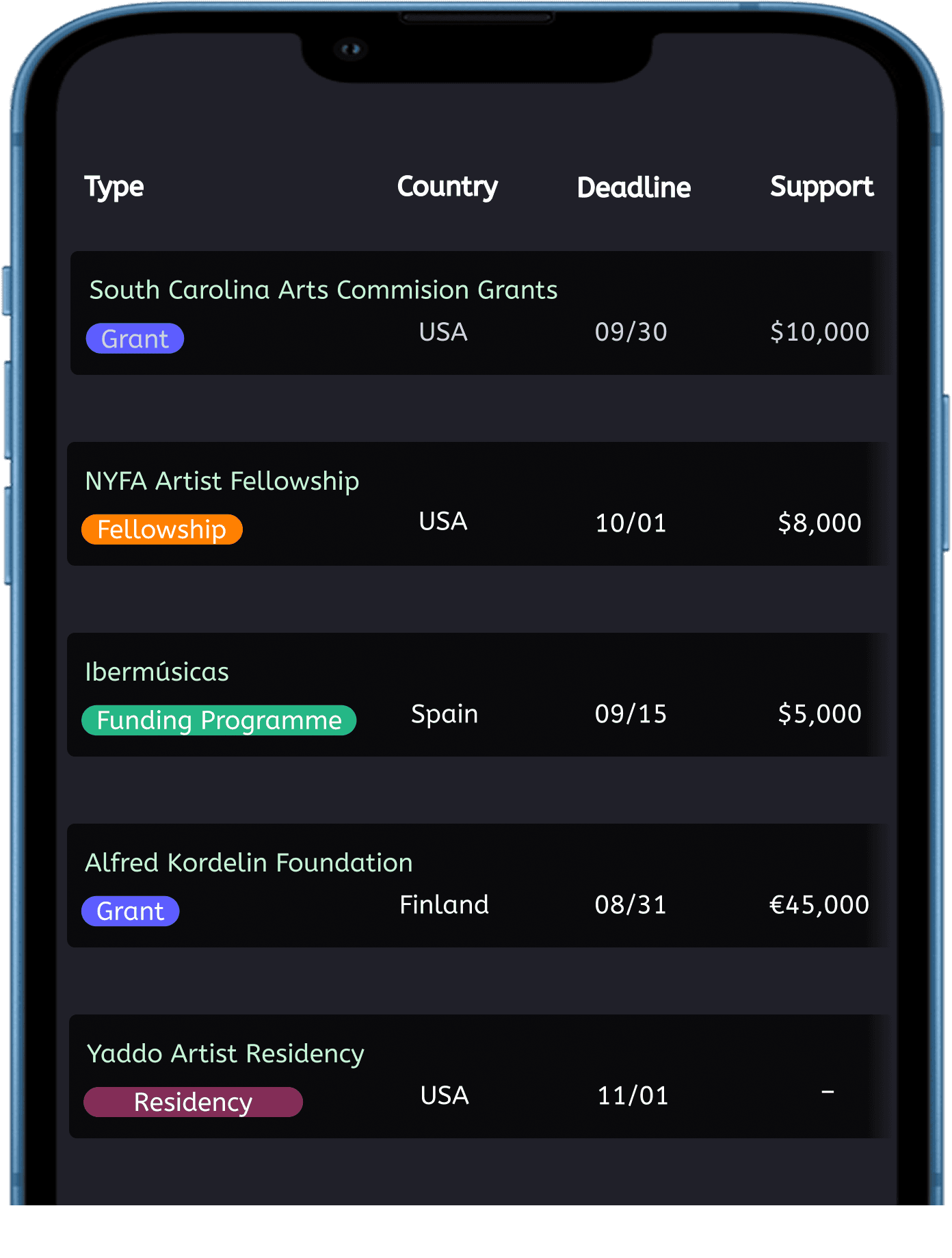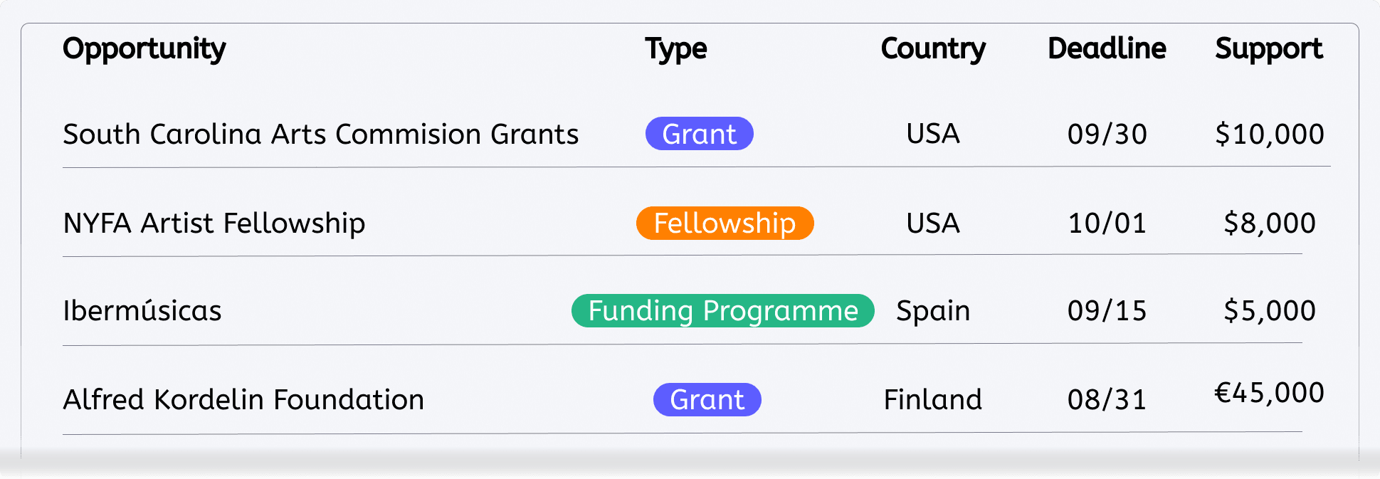 Our team monitors arts councils, foundations, contests, and industry newsletters every day. Automated scrapers flag new or changing deadlines, while human curators verify details, add summaries, and tag each listing for easy filtering—keeping the calendar fresh and reliable year-round.